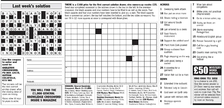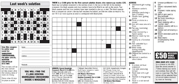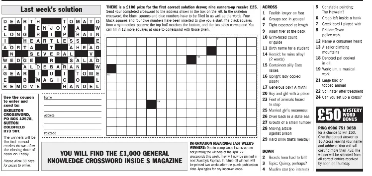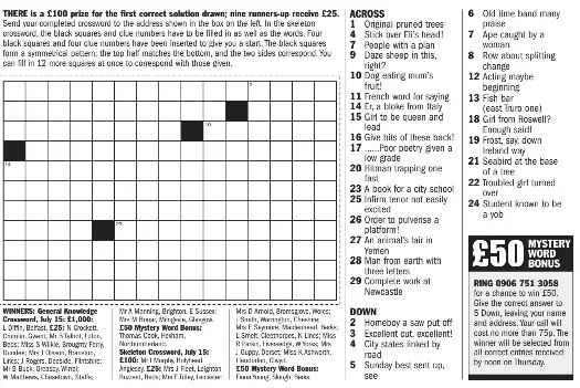 THE SKELETON CROSSWORD - £325 in prizes - PressReader Sunday Express. THE SKELETON CROSSWORD - £325 in prizes 2022-06-19 - There is a £100 prize for the first correct solution drawn; nine runners-up receive £25. Send your completed crossword to the address shown in the box below left. In the skeleton crossword, the black squares and clue numbers have to be filled in as well as the words.