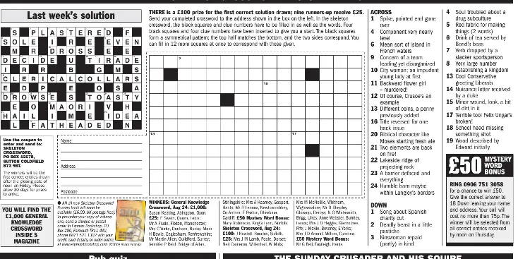 Sunday Crossword Solutions - KeyTriv Sunday Crossword Solutions Knowledge Crusader Mail You Page General More... Monday Name Word Random Cryptic Skeleton Less... Tip Jar: - My solution to the S Magazine £1000 Prize Crossword. - My solution to The Crusader And His Squire. - My solution to The Mail On Sunday £1500 Prize Crossword. - My solution to You Magazine Prize Crossword.
