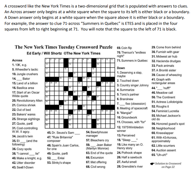 Crossword - Wikipedia A crossword is a word puzzle that usually takes the form of a square or a rectangular grid of white- and black-shaded squares. The goal is to fill the white squares with letters, forming words or phrases, by solving clues, which lead to the answers.In languages that are written left-to-right, the answer words and phrases are placed in the grid from left to right ("across") and from top to ...